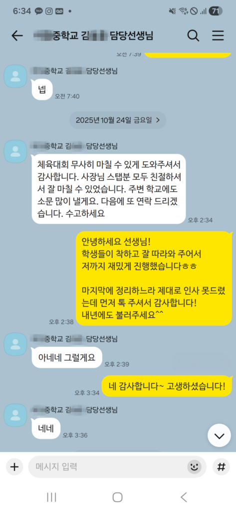 운동회 전문 업체라는 이유만으로 안전하게 잘 해주겠지라는 믿음을 가지고 계시진 않나요? 스쿨하이에서는 운동장 4분면 + 가운데에 안전 요원을 배치하고, 안전 문제가 생기면 무전기로 실시간 보고하고 있습니다. 안전만큼은 스쿨하이가 운동회날 유일하게 웃음기 빼고 신경 쓰는 영역입니다.